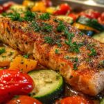 Grab a large baking sheet. Place your seasoned salmon right in the middle. It’s the star of the show! Now, arrange your veggies. Scatter the halved cherry tomatoes, chopped zucchini, and red bell pepper around the salmon. They’ll roast up beautifully. Drizzle a little more olive oil over the vegetables. Sprinkle them with a pinch of salt and pepper too. This makes sure they are just as tasty.